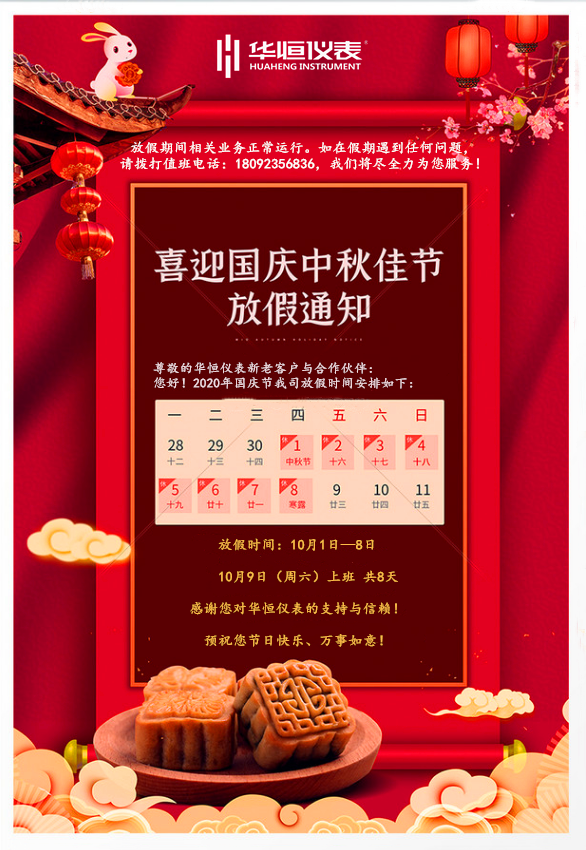 您好!感謝您對華恒儀表的支持與信賴!2020年國慶佳節(jié)將至,在這舉國歡騰、普天同慶的時刻,華恒全體員工向您及您的家人致以最真誠的祝福與問候!