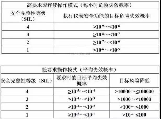 安全完整性等級(jí)可分為4個(gè)等級(jí),SIL4是安全完整性最高的等級(jí)(平均概率最高),SIL1是最低等級(jí);安全完整性等級(jí)越高,應(yīng)執(zhí)行所要求的安全功能的概率也越高;根據(jù)安全相關(guān)系統(tǒng)使用方式,要求發(fā)生的頻率可分為低要求操作模式(<=1次/年)和高要求或連續(xù)操作模式(>1次/年)。