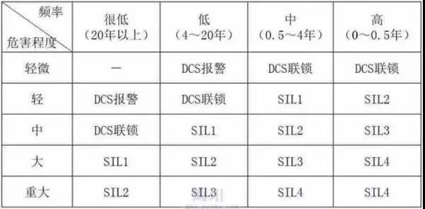 采用不同的操作模式結(jié)構(gòu)有可能使用幾個(gè)安全完整性等級(jí)較低的系統(tǒng)來(lái)滿足一個(gè)較高安全完整性等級(jí)功能的需要(例如:使用一個(gè)SIL2和一個(gè)SIL1的系統(tǒng)共同來(lái)滿足一個(gè)SIL3功能的需要)。不同的工藝過(guò)程(生產(chǎn)規(guī)模、原料和產(chǎn)品的種類、工藝和設(shè)備的復(fù)雜程度等)對(duì)安全的要求是不同的。一個(gè)具體的工藝過(guò)程,是否需要配置SIS、配置何種等級(jí)的SIS,其前提應(yīng)該是對(duì)此具體的工藝過(guò)程進(jìn)行風(fēng)險(xiǎn)評(píng)估,要進(jìn)行危險(xiǎn)及可操作性分析(HAZOP),然后辨識(shí)出與此分析相應(yīng)的安全儀表功能(SIF),(找到一個(gè)安全儀表連鎖回路),再根據(jù)風(fēng)險(xiǎn)出現(xiàn)的頻率和其產(chǎn)生的嚴(yán)重后果,找到一個(gè)與此SIF相應(yīng)的SIL值,在確定了某個(gè)安全儀表功能的完整性等級(jí)(SIL)之后,再配置與之相適應(yīng)的SIS。表1-3可以看出,若某工藝過(guò)程的所需SIF經(jīng)評(píng)定后為SIL 2,則配置達(dá)到AK4的SIS即可,其響應(yīng)失效率(PFD)為百分之一至千分之一之間。應(yīng)該注意的是不同安全級(jí)別的SIS,只能確保響應(yīng)失效率(PFD)在一定的范圍內(nèi),安全級(jí)別越高的SIS,其PFD越小,即發(fā)生事故的可能性越小,但它不能改變事故造成的后果。因此,工藝過(guò)程安全完整性等級(jí)的評(píng)定是一項(xiàng)十分重要的工作。但目前我國(guó)尚無(wú)如何評(píng)定安全完整性等級(jí)的標(biāo)準(zhǔn)和規(guī)范。國(guó)際、國(guó)外標(biāo)準(zhǔn)中提供了某些評(píng)定方法。下面介紹的風(fēng)險(xiǎn)矩陣(RISK MATRIX)評(píng)估方法可供參考。