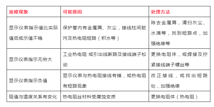 工業(yè)熱電阻的常見(jiàn)故障是工業(yè)熱電阻斷路和短路。一般斷路更常見(jiàn),這是因?yàn)闊犭娮杞z較細(xì)所致。斷路和短路是很容易判斷的,可用萬(wàn)用表的“×1Ω”檔,如測(cè)得的阻值小于R0,則可能有短路的地方;若萬(wàn)用表指示為無(wú)窮大,則可判定電阻體已斷路。電阻體短路一般較易處理,只要不影響電阻絲長(zhǎng)短和粗細(xì),找到短路處進(jìn)行吹干,加強(qiáng)絕緣即可。電阻體斷路修理必須要改變電阻絲的長(zhǎng)短而影響電阻值,為此以更換新的電阻體為好,若采用焊接修理,焊接后要校驗(yàn)合格后才能使用。熱電阻測(cè)溫系統(tǒng)在運(yùn)行中常見(jiàn)故障及處理方法如下表: