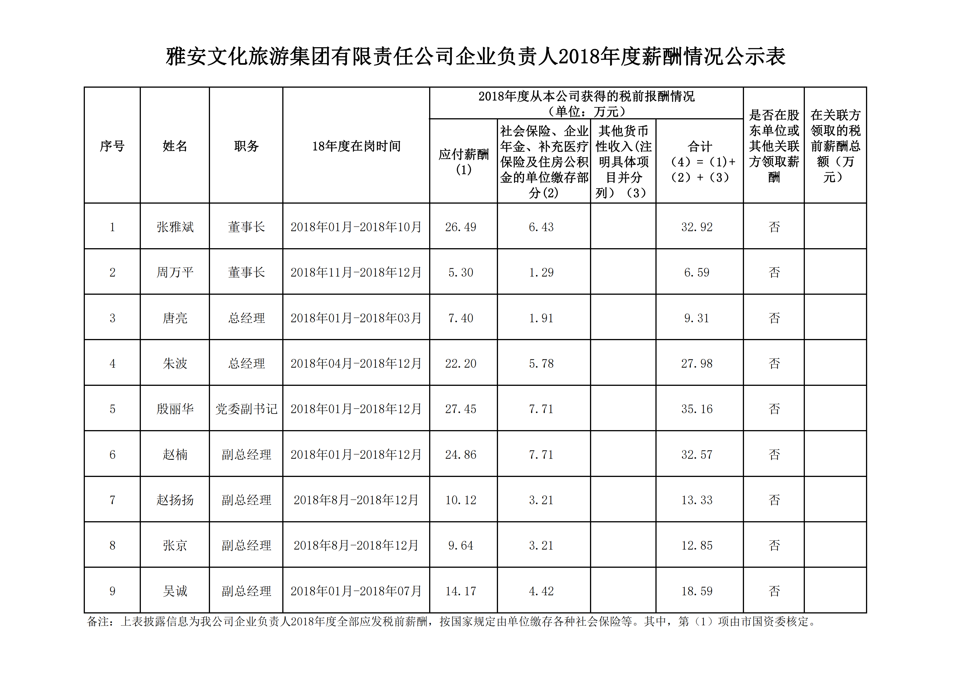 雅安文化旅游集團有限責(zé)任公司企業(yè)負責(zé)人2018年度薪酬情況公示表