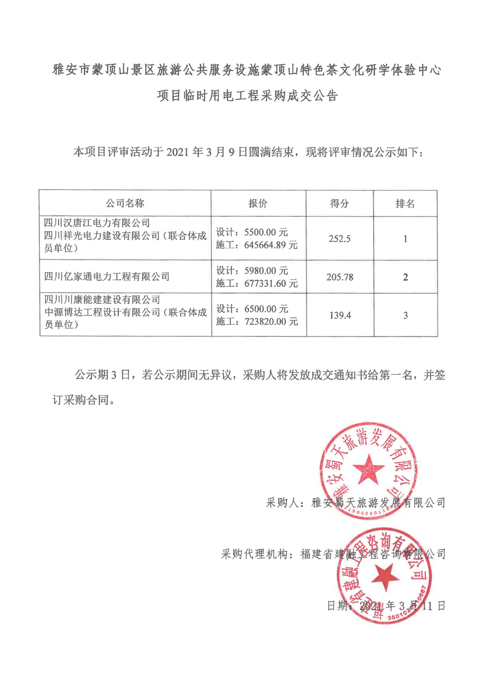 雅安市蒙頂山景區(qū)旅游公共服務(wù)設(shè)施蒙頂山特色茶文化研學(xué)體驗中心項目臨時用電工程采購成交公告