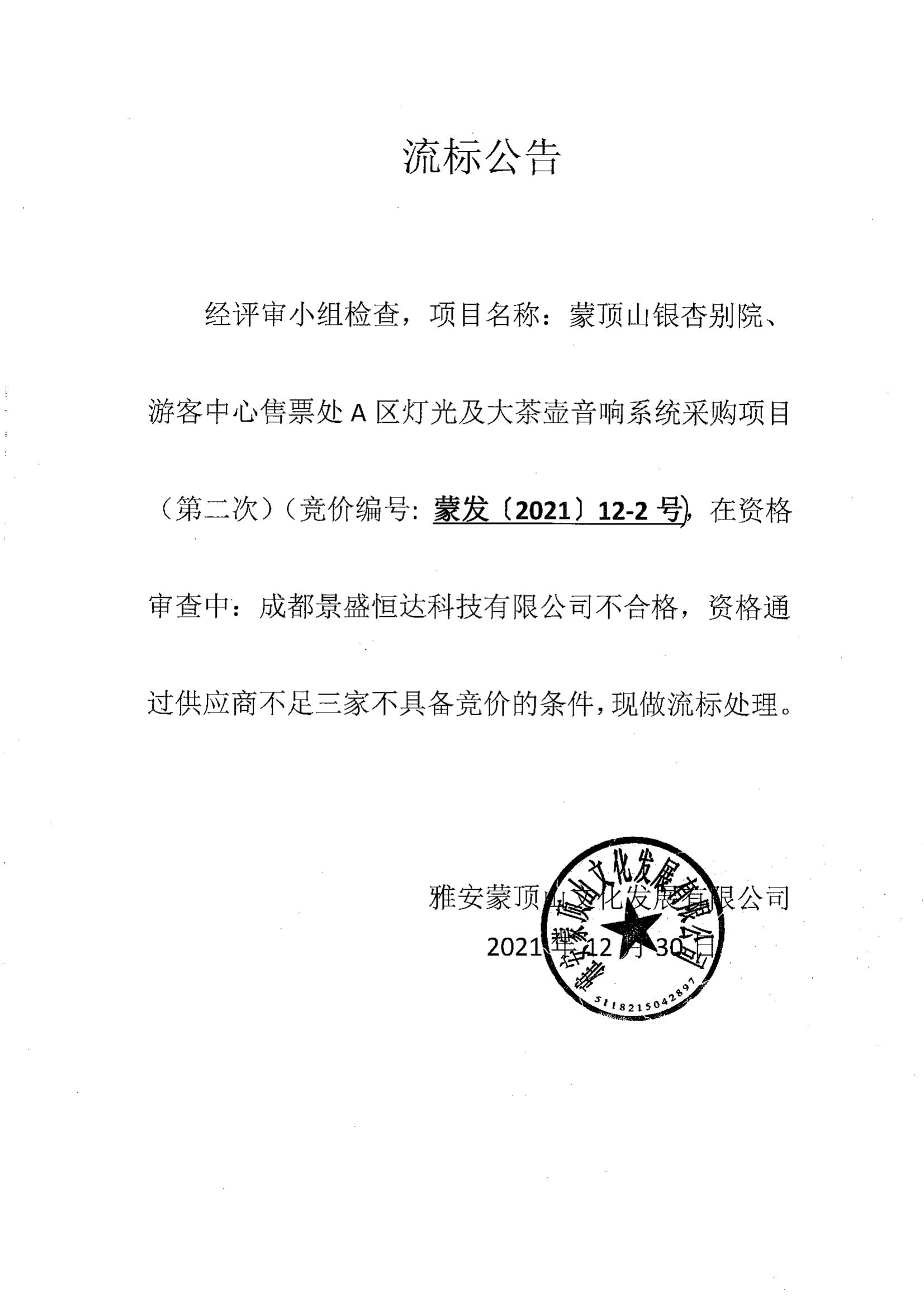 蒙頂山銀杏別院、游客中心售票處A區(qū)燈光及大茶壺音響系統(tǒng)采購(gòu)項(xiàng)目(第二次)流標(biāo)公告