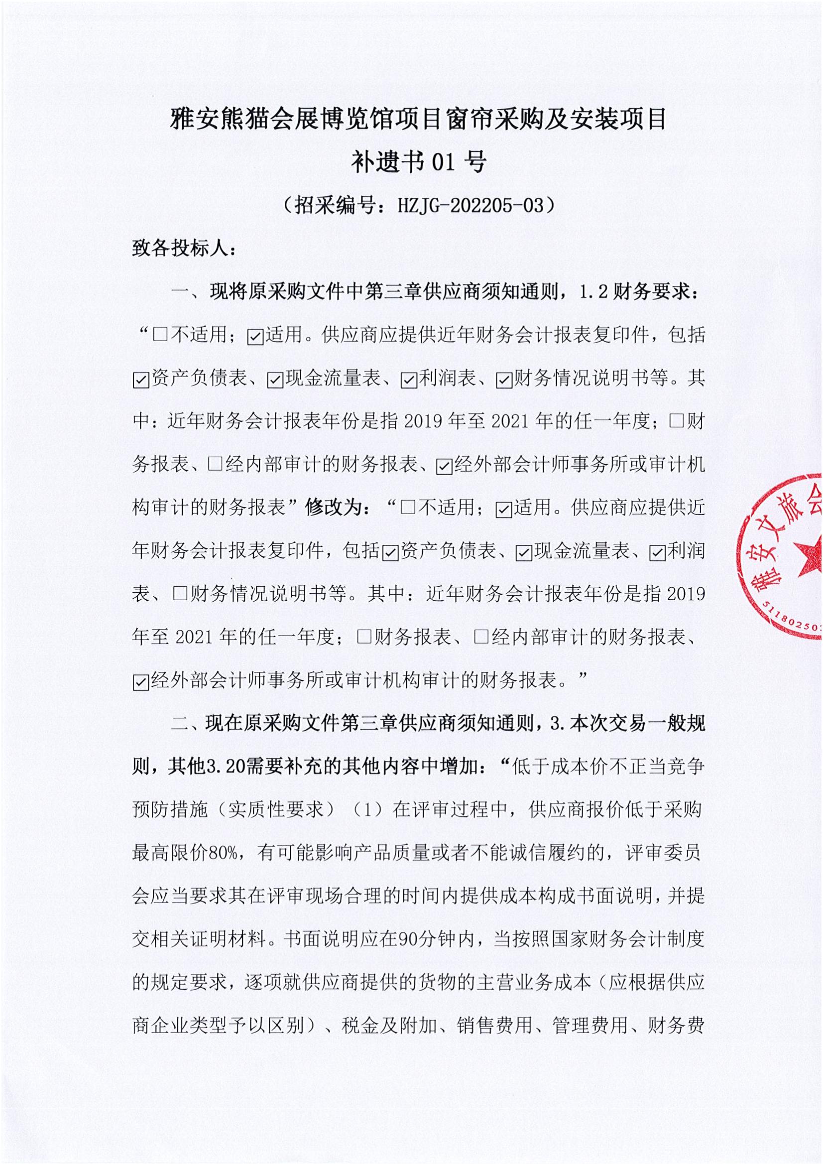 雅安熊貓會(huì)展博覽館項(xiàng)目窗簾采購補(bǔ)遺書01號(hào)