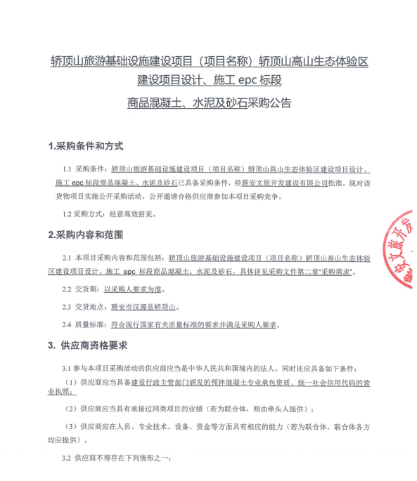 轎頂山旅游基礎(chǔ)設(shè)施建設(shè)項目 (項目名稱)轎頂山高山生態(tài)體驗區(qū)建設(shè)項目設(shè)計、施工epc標段商品混凝土、水泥及砂石采購公告