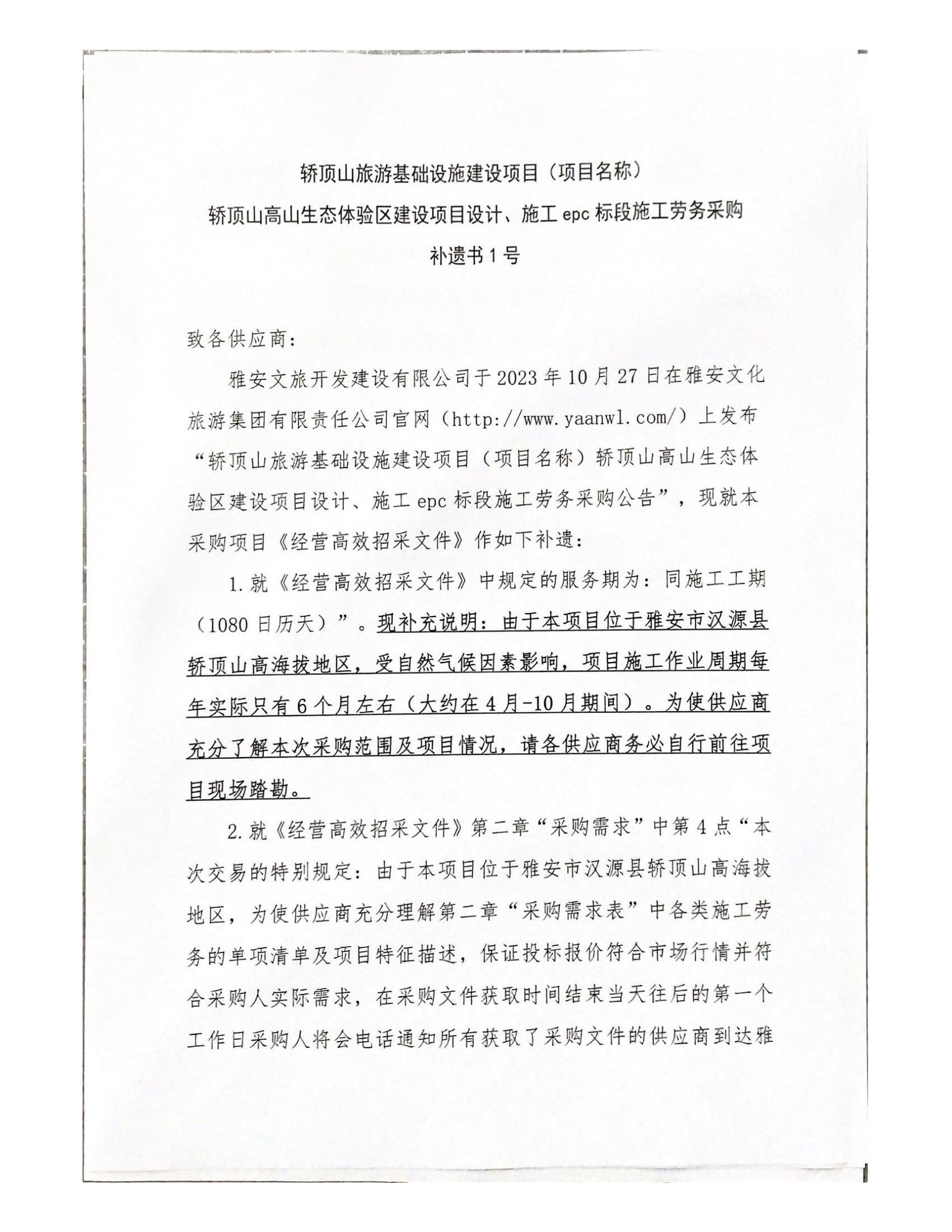 轎頂山旅游基礎(chǔ)設(shè)施建設(shè)項目《項目名稱)轎頂山高山生態(tài)體驗區(qū)建設(shè)項目設(shè)計、施工 epc 標(biāo)段施工勞務(wù)采購 補遺書1號